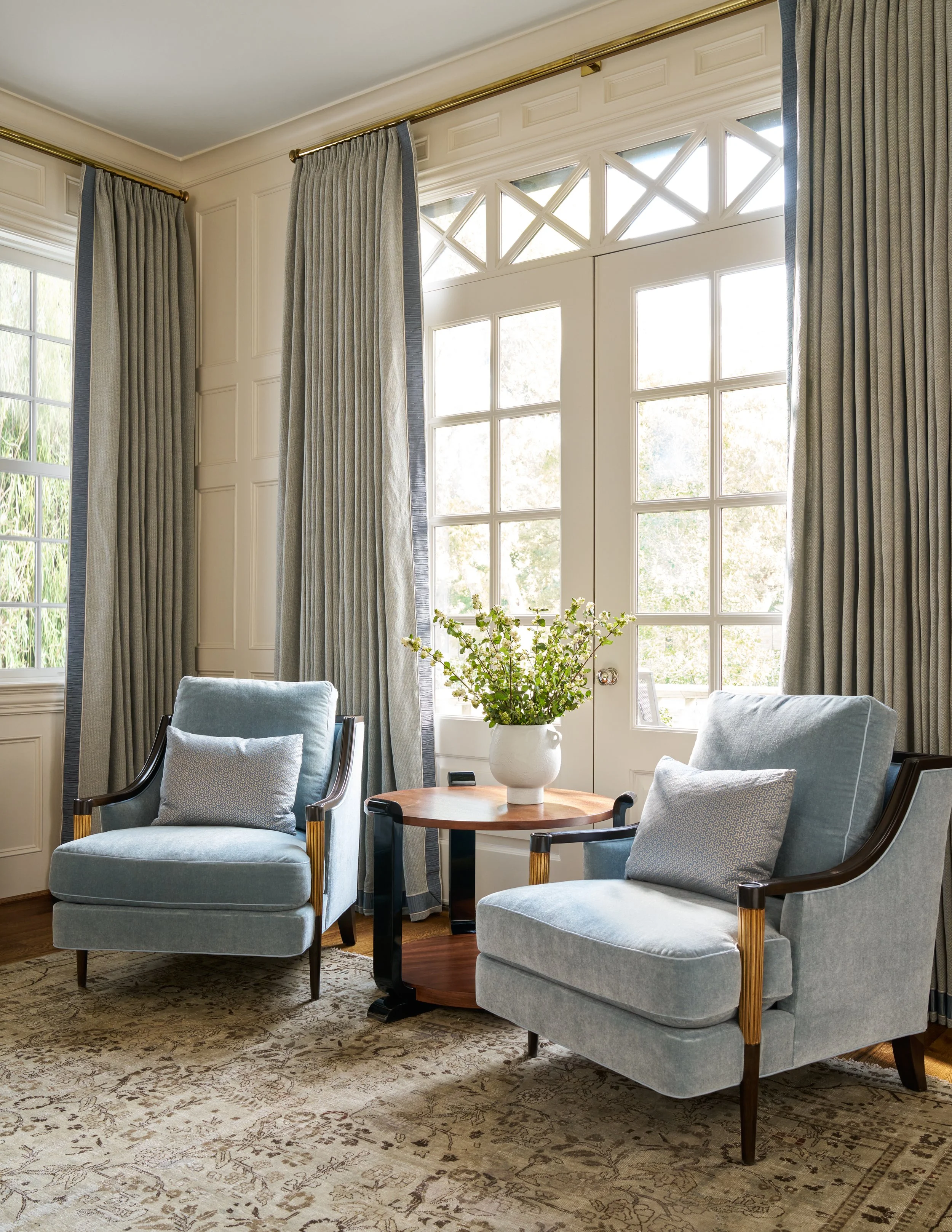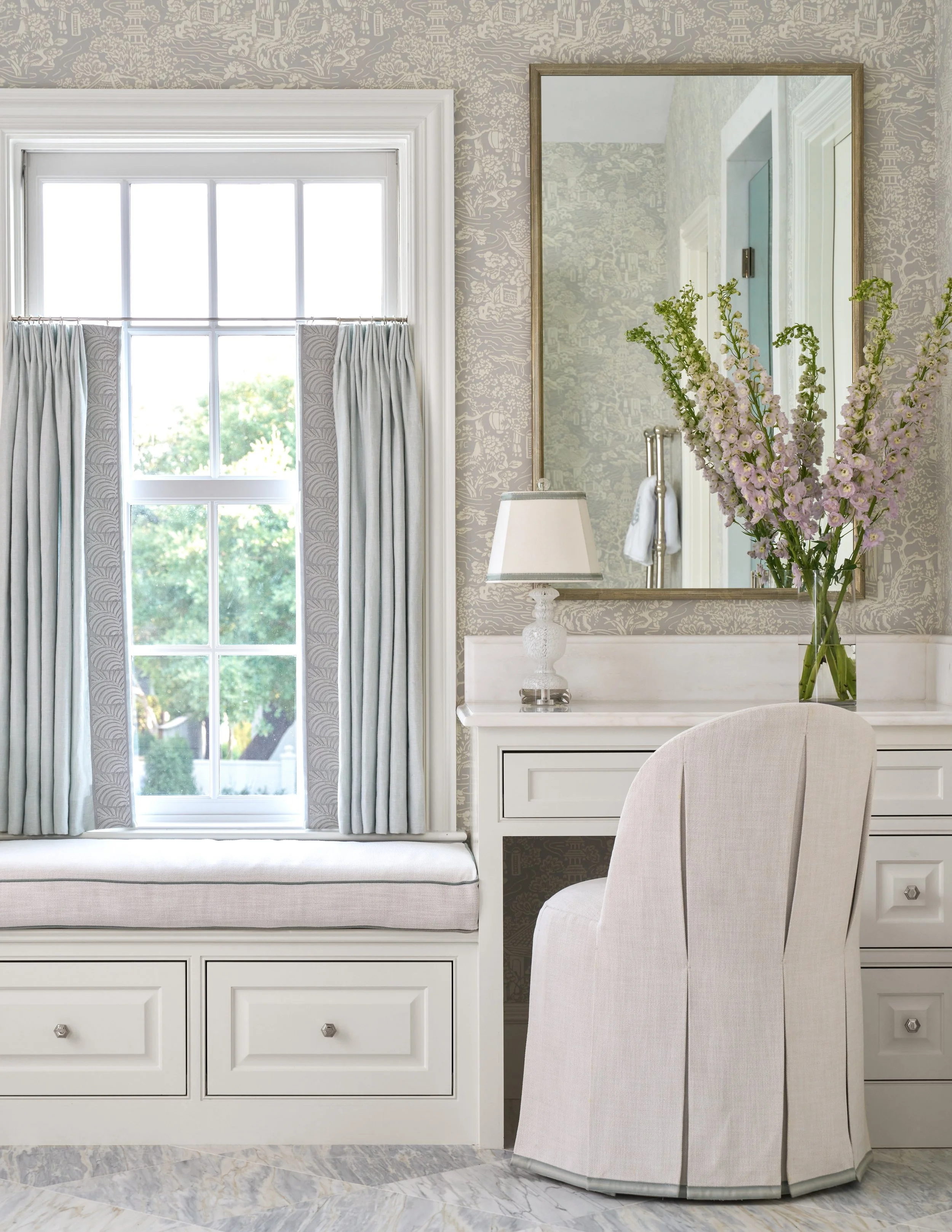 Wisteria Elegance captures the essence of refined tranquility through a palette of soft blues & lavenders, layered textures, and graceful detailing. This design scheme evokes the charm of an English garden in spring, paired with timeless architectural elements and bespoke finishes. The result is a home that feels both serene and elevated—an inviting escape rooted in quiet luxury.